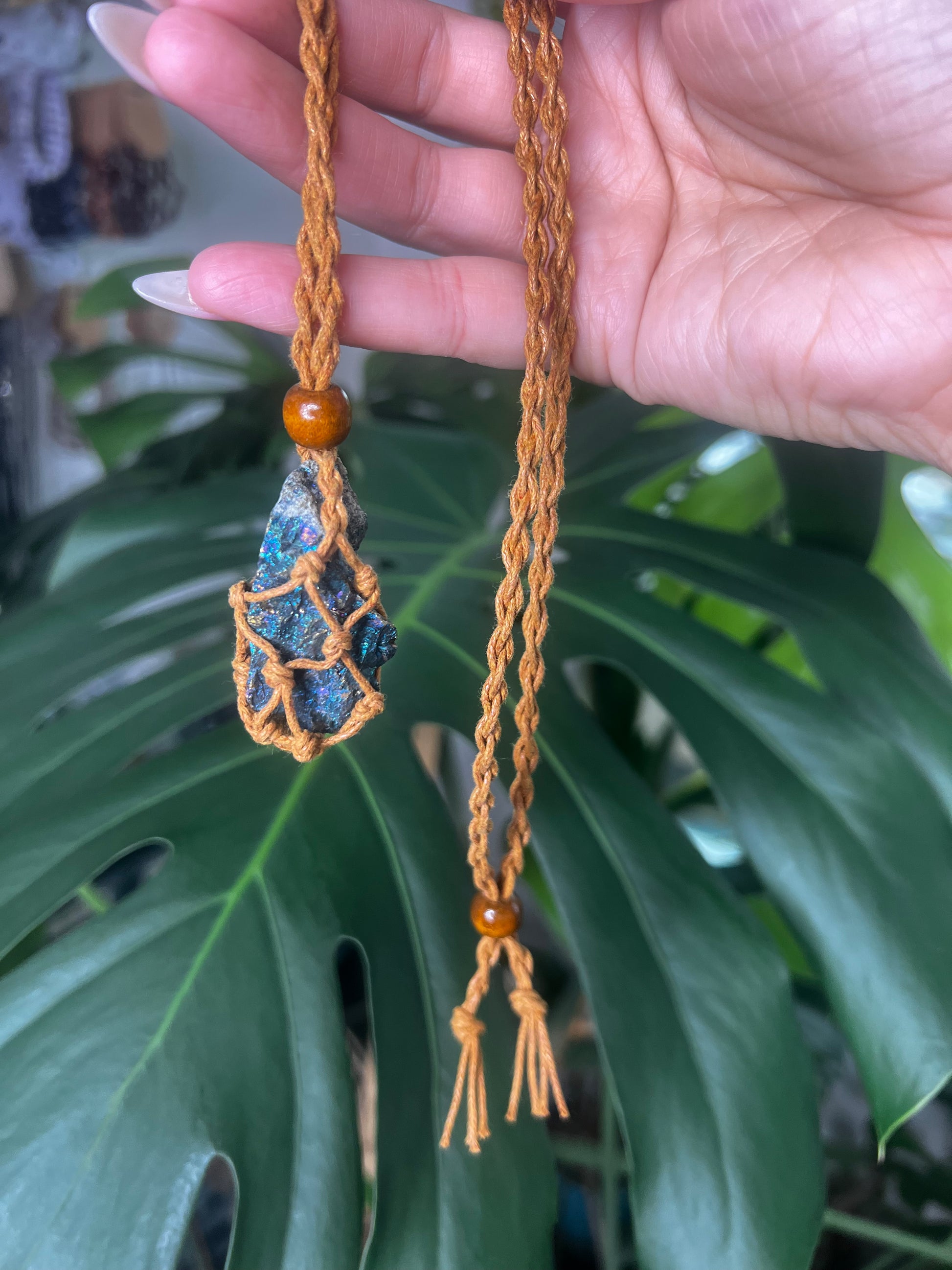 These macramé crystal pouches are a simple, stylish way to keep your favorite stones close. Made with durable woven cord and finished with wooden beads, each one features a flexible net that expands to fit most crystal shapes—raw, tumbled, polished, or heart-shaped.